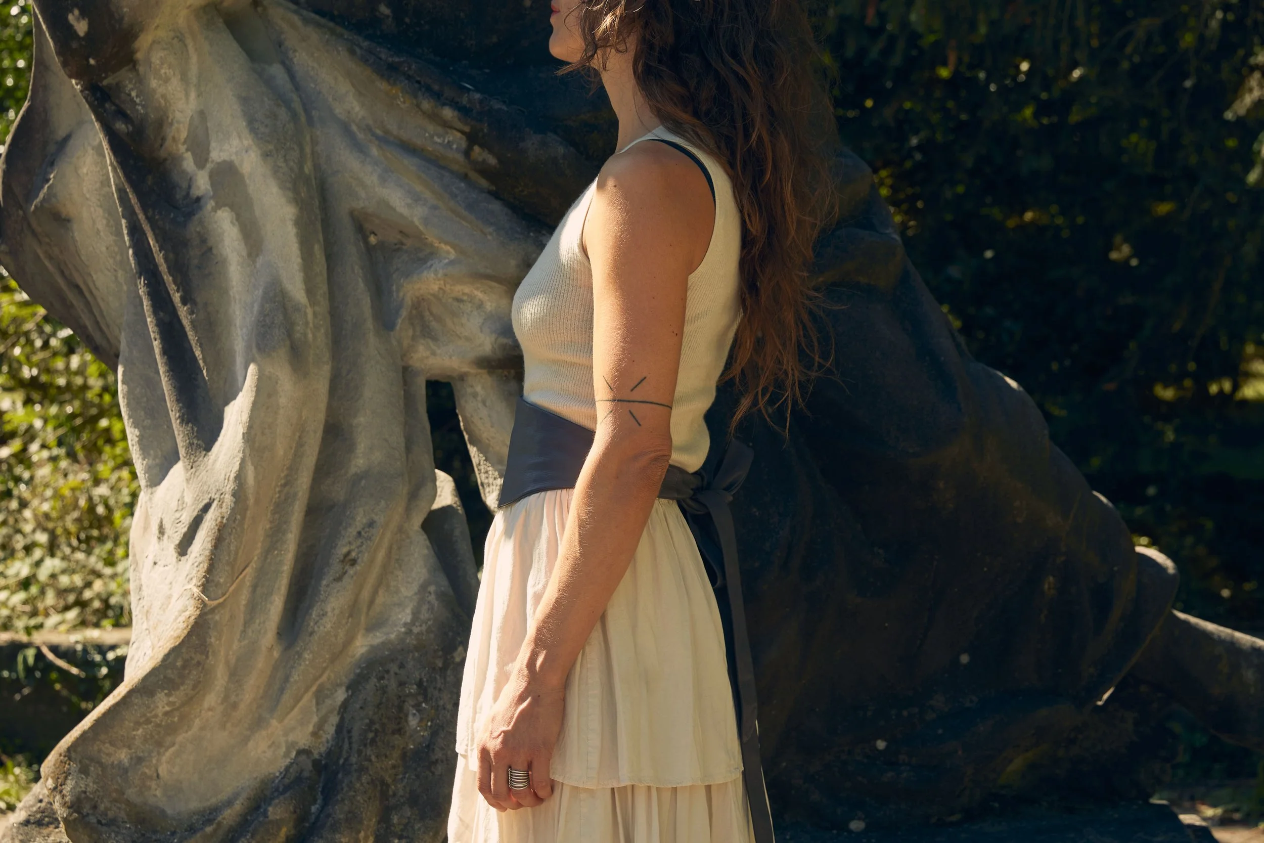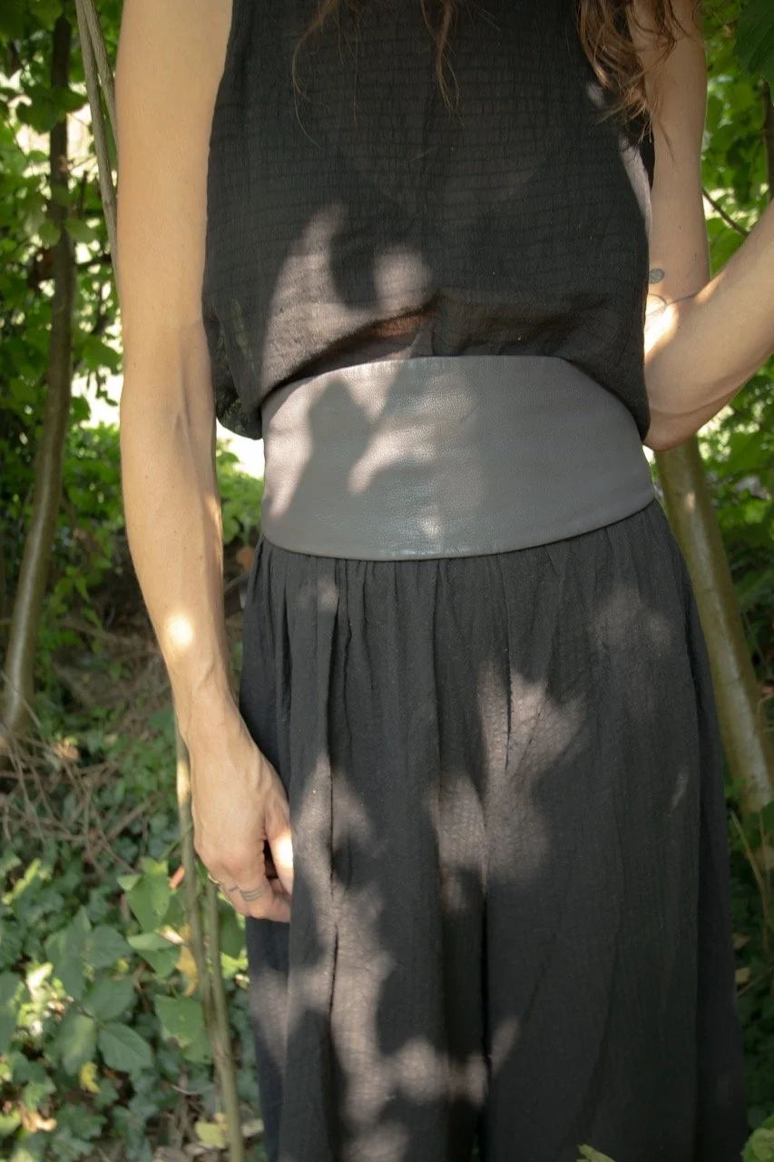 Nina: Am liebsten über einem weiten Mantel oder einem langen Hemd. Wenn aus etwas Fliessendem plötzlich eine Silhouette wird. Oder eben ganz pragmatisch: eine Jacke zusammenhalten, die es ohne ihn nicht täte. Unseren Taillengurt trage ich oft über Outfits, wenn ihnen noch dieser letzte Feinschliff fehlt – gerade, wenn ich noch ausgehe. Er vollendet den Look unaufgeregt, ohne sich in den Vordergrund zu drängen. Es sind diese Momente, wo ein einziges Detail den ganzen Look trägt. Ruhig, aber präzise.